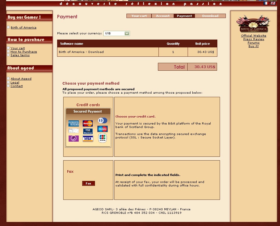 It looks like the good AGEOD folk have fixed the problem, so I'm glad I waited (although last night I noodled around a little with the nationalities and found that Canadians, Mexicans - in fact, all non-Europeans - were affected just like Americans, so we need not feel alone. I tried pretending to be an Antarctican and got a pay option that appeared to be credit-card related, but when I clicked it, it cancelled my order. I must not have been convincing ...).