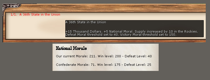 I've already reported one bug with a tooltip's listed victory conditions. I found another. I was playing the Union in early November, 1864. Nevada entered the Union, changing the victory conditions. The tooltip for the Nevada event says I need NM of 150; the victory screen says 200. (Either is an improvement over 225, which was the requirement before this event!) Here's an (edited) screenshot. Notice also that "morale" is spelled wrong again.