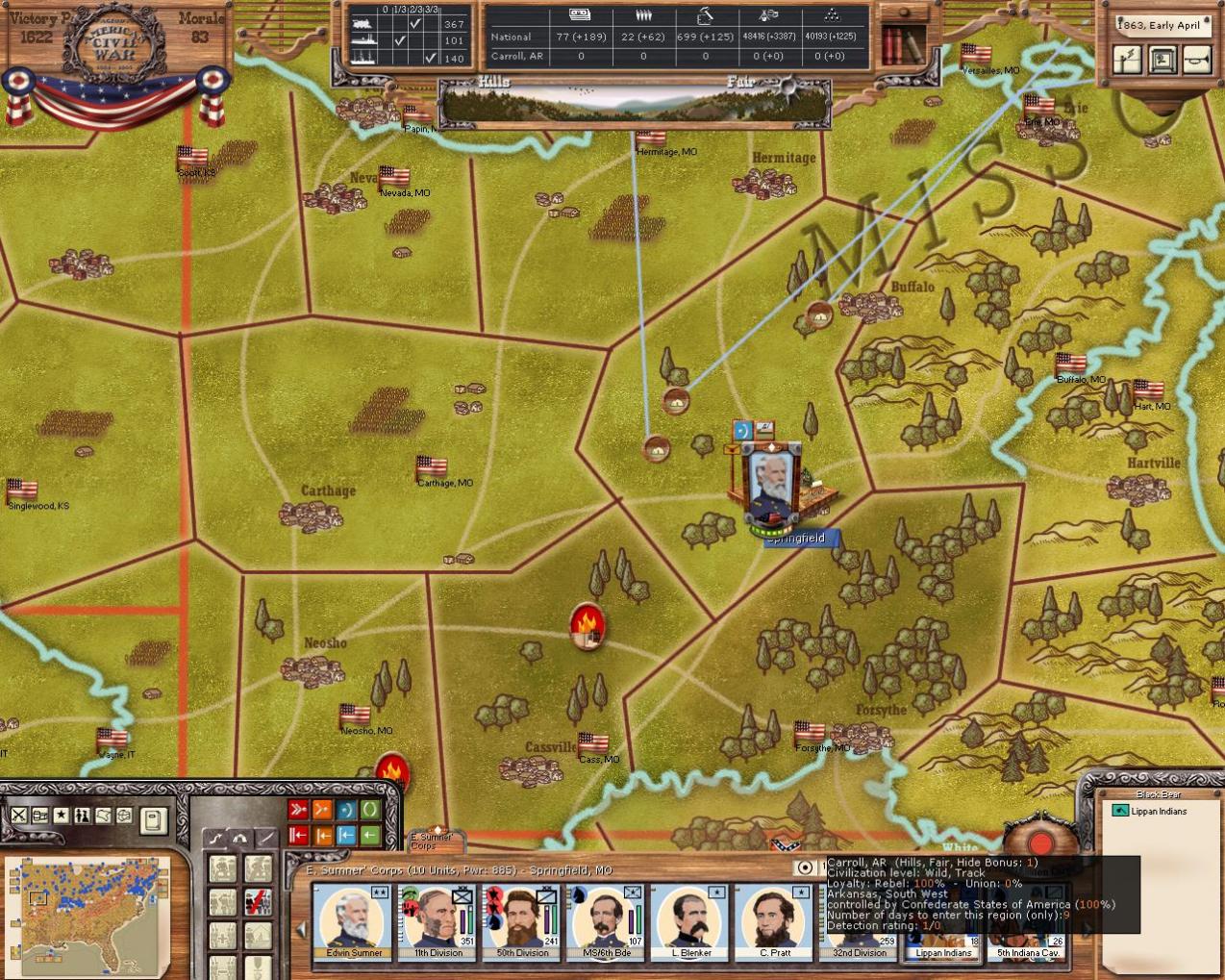 I noticed when putting the Lippan Indians into a division with other cav units, the nato symbol switches from cav to inf. At first I was afraid that they were actually considered inf for movement and that the picture was wrong, but after checking the stats and testing that they moved mounted like the other cav I realized it was just probably the wrong nato symbol being assigned. No biggie, but it could confuse someone else.