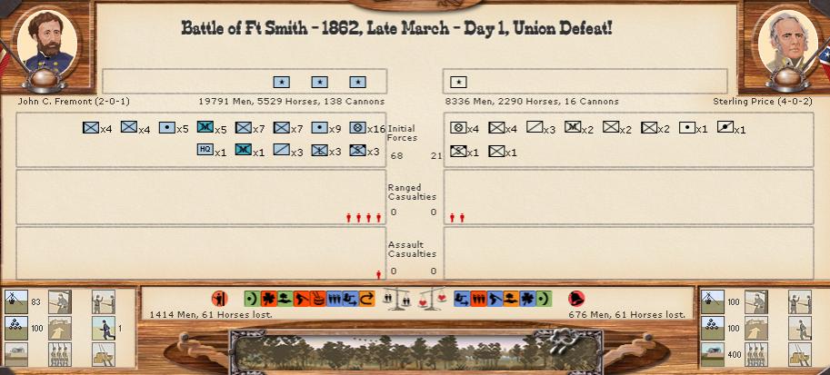 Own Force: Fremont + HQ and three recently outsorced Divisions. I mean, I divested them in the planning phase from Fremont. All units had already been at Fort Smith region.
