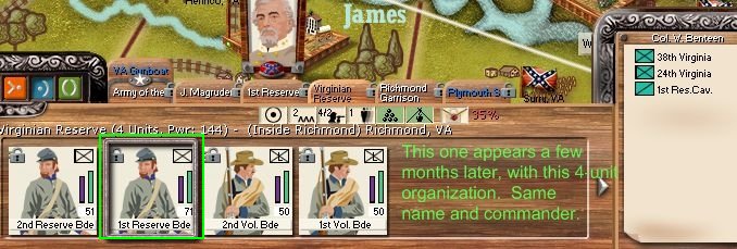 1st VA Reserve Brigade. Appears as a solo unit in, I think, late May. Appears again in late June or July, this time with three other units. Images below provide more info. Unit has same subcommander and elements, although slightly different strengths.
