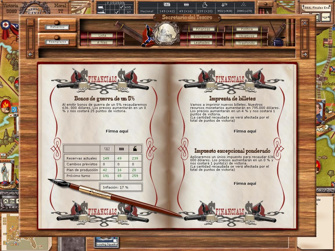 ... bloquearme en James, bloqueando con ello el puerto de Richmond, y además tiene varias flotillas de bloqueo en AMBAS cajas de bloqueo, por lo que normalmente el porcentaje de bloqueo anda entre un 45% y un 55%, con lo que no sólo me corta mucho la recepción de dinero, sino también sobre todo la recepción de suministros de guerra, con lo que me coarta la construcción de ironclads y cañones para luchar con él por el control del río Mississippi, y tengo muy bajo mi número de transporte ferroviario, ya que se me hace muy caro pagar 10 de mis preciosos suministros de guerra por sólo 10 puntos de transporte de ferrocarril...