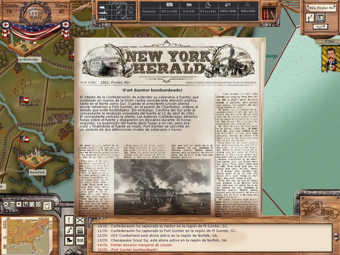 Ahora voy por inicios de septiembre, me he hecho fuerte en Harper's Ferry y Manassas, el Sur invadió Kentucky y está teniendo la respuesta correspondiente, mientras en Missouri la cosa está más o menos estable. En Nueva York y Boston se está concentrando una fuerza que atacará las fortificaciones rebeldes costeras por un lado y New Orleana por otro, poniendo en práctica el plan Anaconda de Scott.