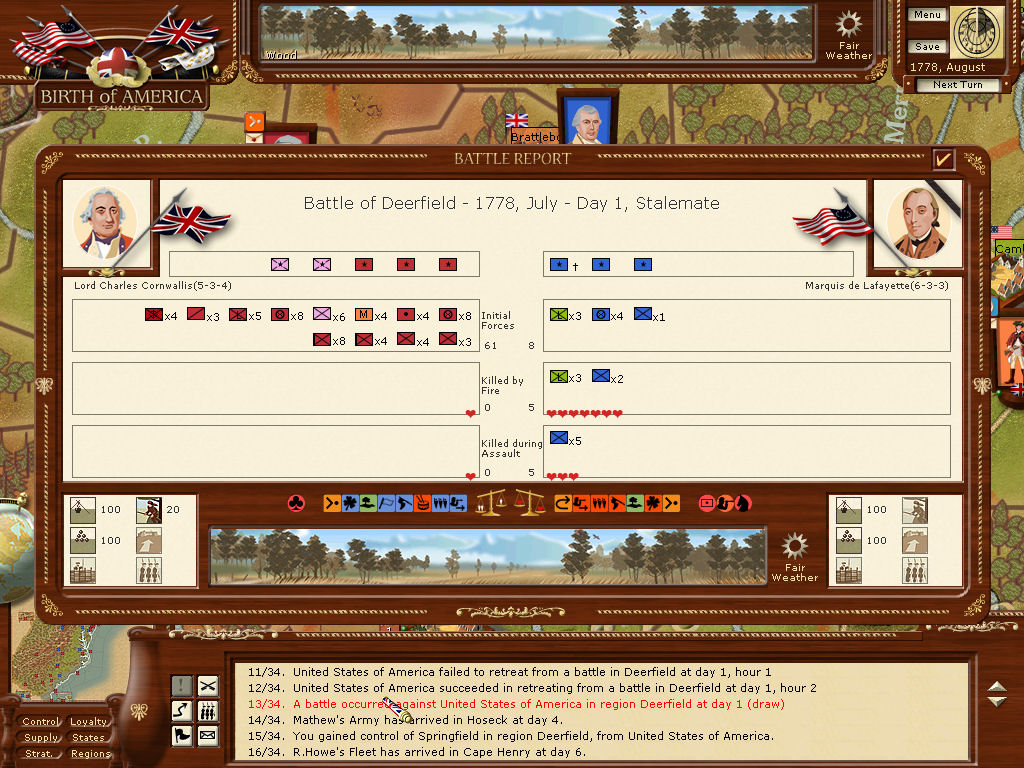 Cornwallis defeated La Fayette in Deerfield, Mass, although the battle report indicates a stalemate. Cornwallis captured a supply train and then took Springfield.