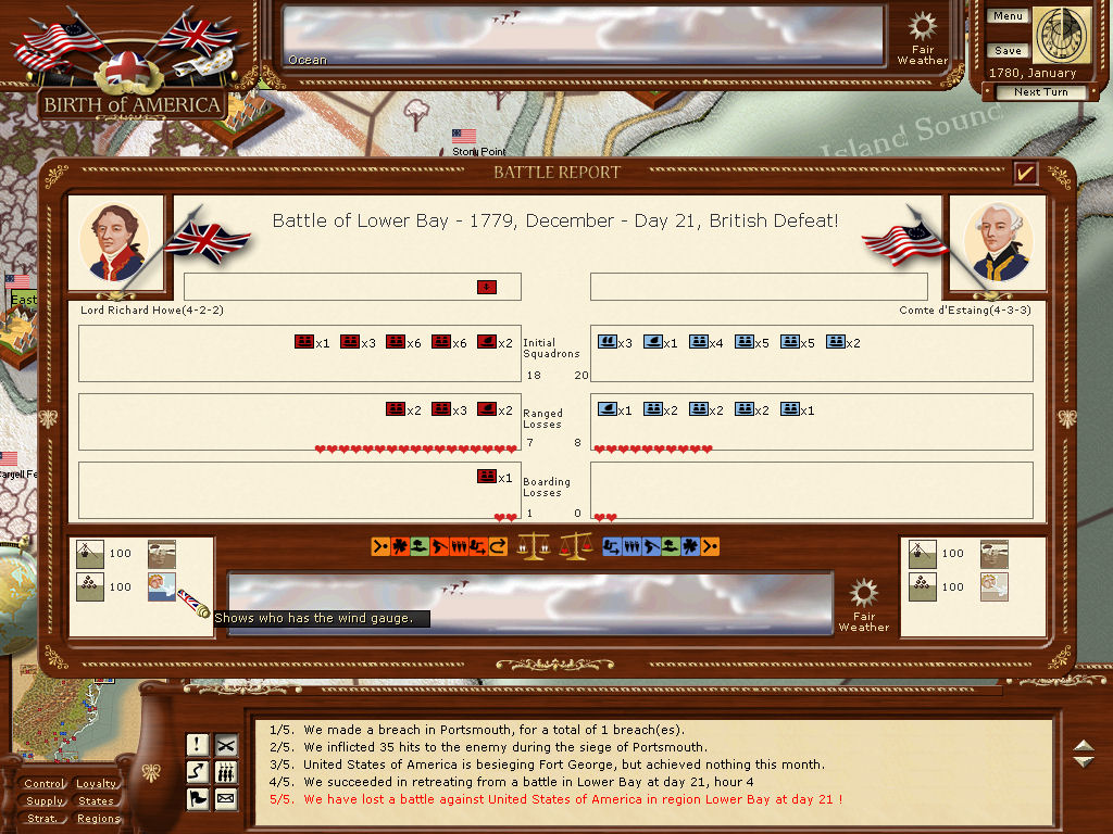 Howe's fleet is defeated off Manhatten by de 'Estaing. If I read the report correctly, Howe had: