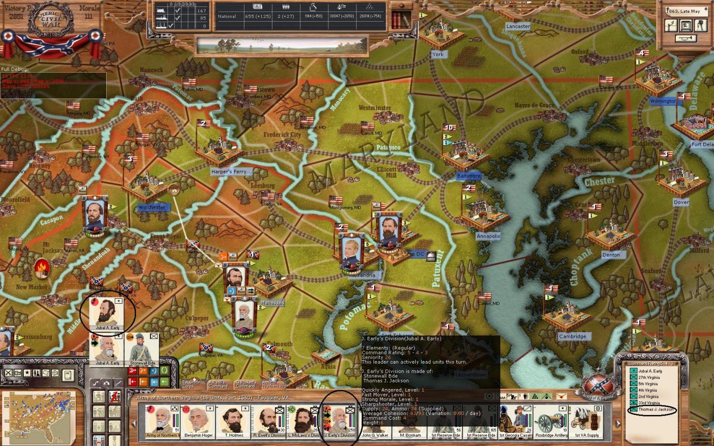 Playing as Union in 1862, I beleive I'm in late March. Hold most of Missouri except Springfield. Kentucky has been mostly been squared away except for a small force that went on a counter offense that retook Clarksville. Ft Henry has finally fallen after a 2 month seige. Might of read the reports wrong but I was still facing close to 5,000 troops before I had Sherman all out assault the place. The end saw a battle with 971 casualties for the Rebs, but they finaly gave up. Virginia sees the Union in controll of Winchestor, Harpers Ferry, Manassas, Fredricksburg, with a potential fight brewing at Chanslorsville. The rebs have been assualting Ft Monroe. Butler has held out but at great cost on both sides. I had to send in Burnside and a division to help out. But he has been getting chewed as well. Could be the end of Ft Monroe or it could be the end of the rebel casue as this particualar sector has been a meat grinder.