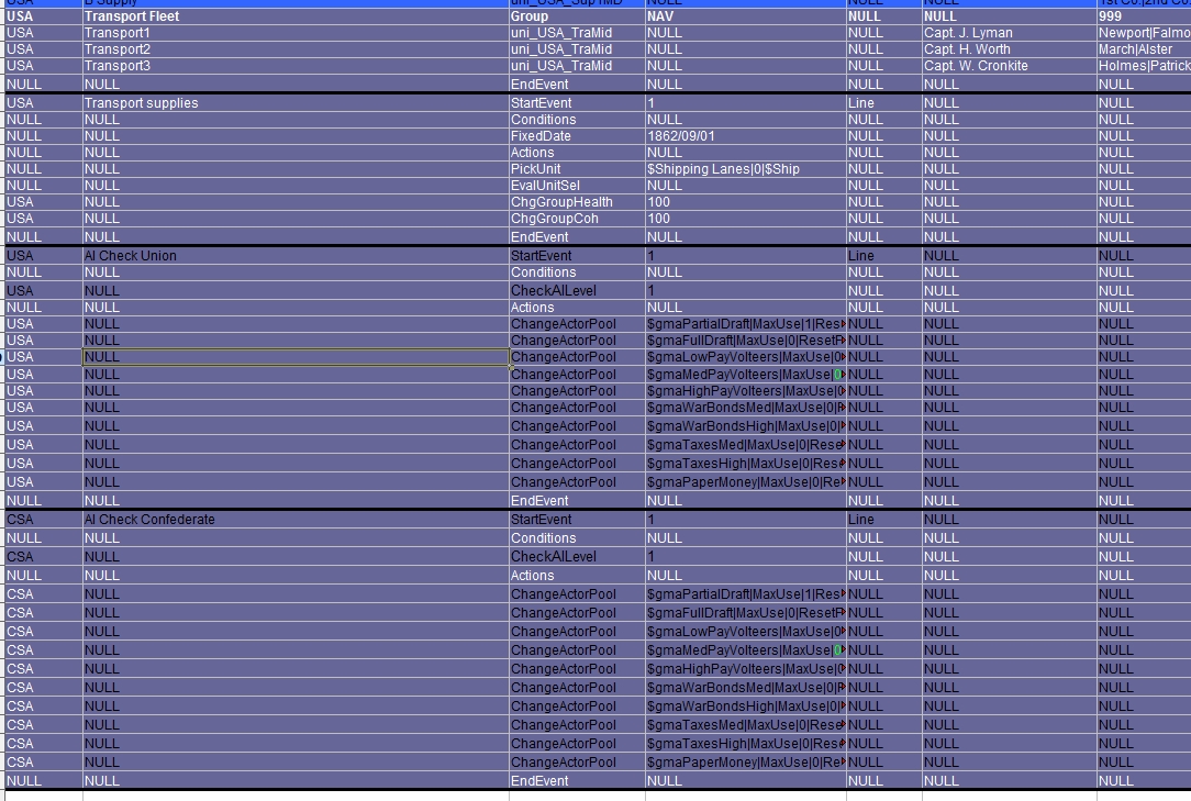 The Scens files when I reinstalled the game and patched in 1.15 are in notepad no .xls by default. Not sure if this is because I did this before or it comes this way, but I can't upload any Scen file into Excel that properly looks like your Tutorial file. Your tutorial file opens fine, but not any of the Scen files.