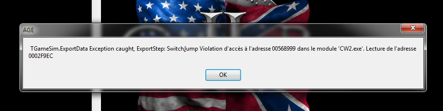 8:38:22 AM [Critical ] TGameSim.ExportData Exception caught, ExportStep: Structures Violation d'accès à l'adresse 00626192 dans le module 'CW2.exe'. Lecture de l'adresse 0002F9E8