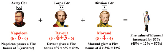 St Cyr has 14 Command Points to allocate but his Force contains 22 CPs worth of units. He has exceeded his allowance by eight (8) CPs and is assessed a 35% movement and combat penalty.