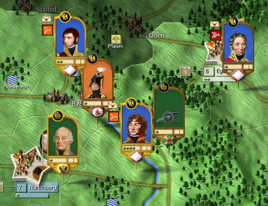 Surprise! Surprise! It seems my crafty Coalition opponent has decided to make a major move on my supply lines by attempting a flanking maneuver north of the Danube. My decision to send Kellermann’s cavalry to Pilsen has revealed the presence of three formations of Russian troops marching toward Bayreuth. Bernadotte’s weakened Corps is going to have a fight on its hands very shortly I fear.