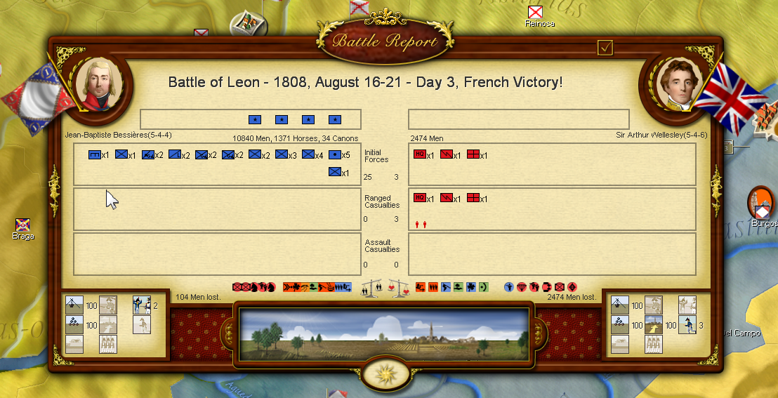 Picture 1 Bessieres corps managed to defeat Wellesley, well his force was residual as you can see. All his men were lost. I have seen this before, a force is completely destroyed but the leader survives. I suppose that Wellesley cannot be killed. But this is a bit unrealistic, some small part of his army should have survived with him? I have seen too (no screenshot sorry) that a strong force can eliminate a weak one completely but the stronger gets 0 losses.