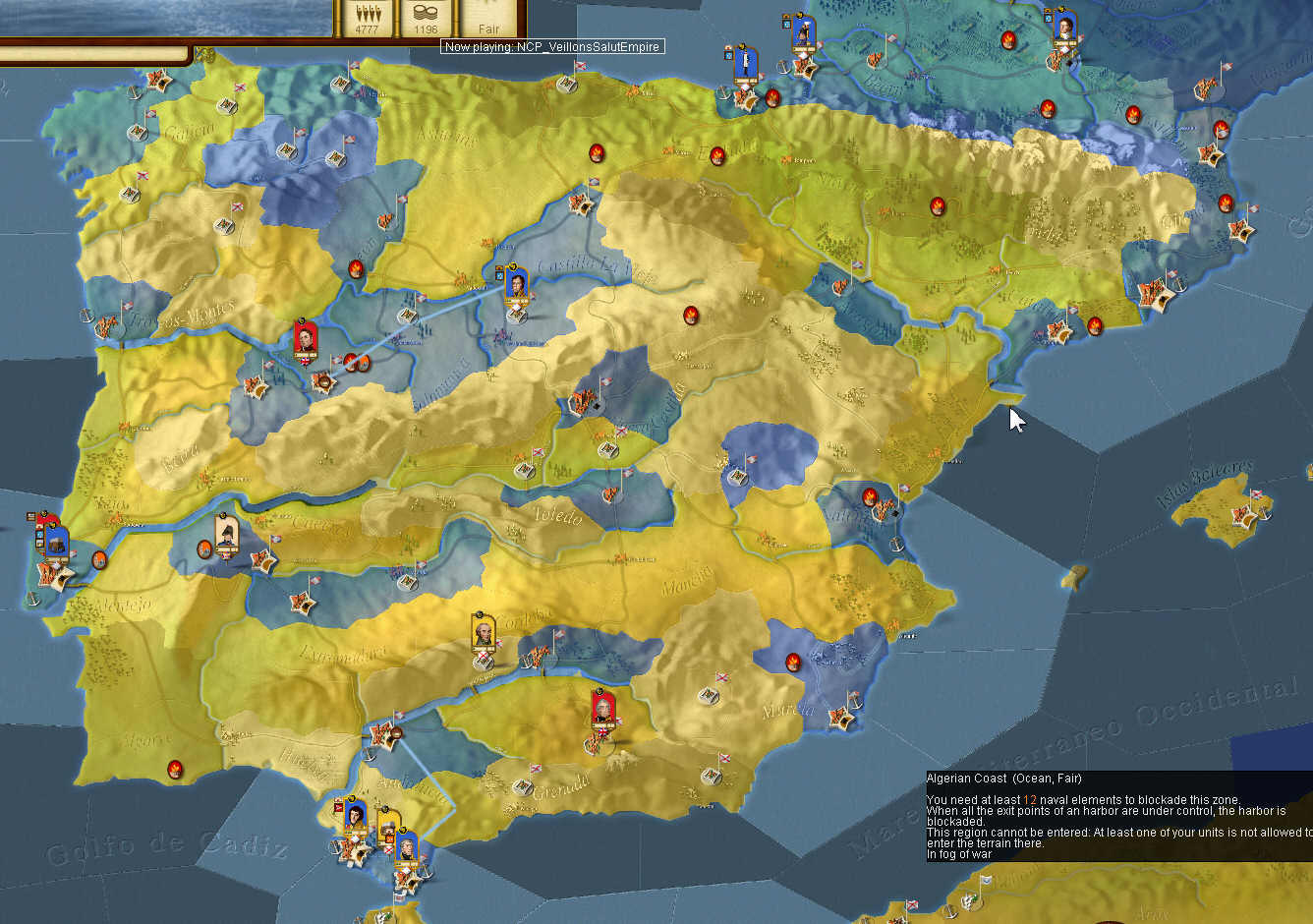 To take Gibraltar was really difficult, the defenses are very strong now, I had to deplete nearly all my army in the peninsula and concentrate several corps around Gibraltrar for the final blow. This must be the cause I lost control of great part of the countryside (picture 2) and so coatilion NM increades to 95