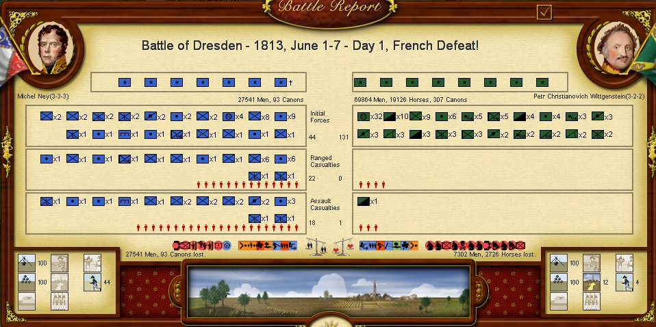 La AI es mucho más pasiva, aunque basicamente mi oponente ha jugado a la defensiva, lo que me permitía tomar rápidamente Hamburgo y avanzar por el norte del Elba hacia Berlín, lo que con el avance de Eugene al sur del Elba se formaba una pinza de efectos devastadores. En este caso mi fallo ha sido no avanzar antes con Eugene tras la falta de resultados en Hamburgo