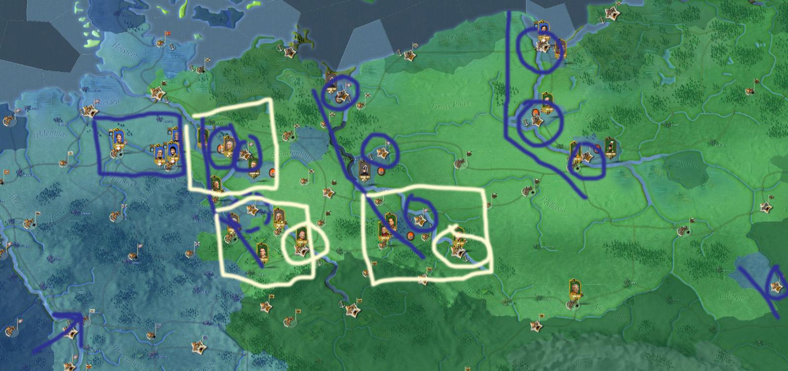 Así por ejemplo, en círculos blancos, controlan las fortalezas de Breslau (que controla el paso sur del río Oder) y Dresde (lo mismo para el sur del Elba). El zar Alejandro I tiene situado su cuartel general en Breslau.