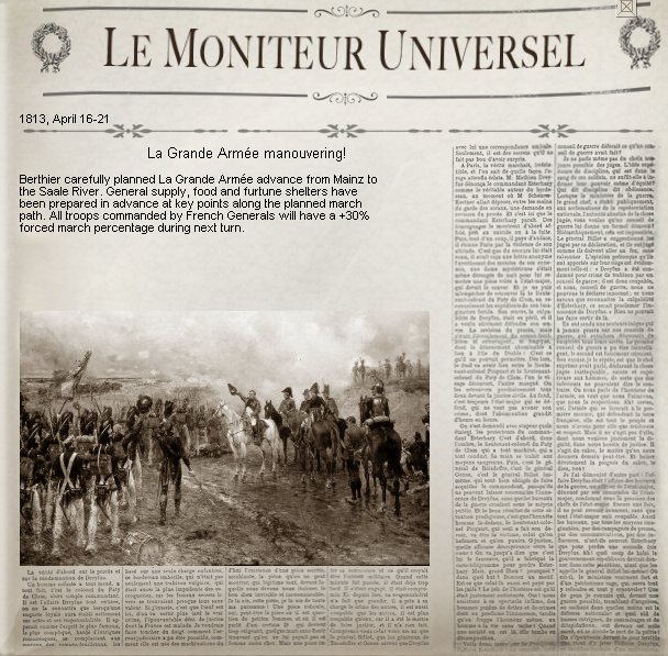 Con el permiso (o mejor sugerencia) de arsan para postear un AAR de mi partidita con jastaV de la campaña que él ha creado para el NCP, abril 1813. Esta campaña no está disponible en el juego original, la campaña de 1813 incluida en el juego es la de otoño, después del final de la tregua, y en la que ocurriría la batalla de Leipzig. La nueva campaña de jastaV se correspondería por lo tanto con las batallas de Lutzen y Bautzen.