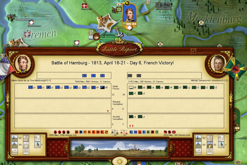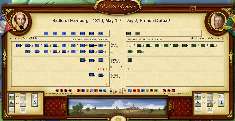 Tras la llegada de los refuerzos de Vandamme se inicia un nuevo asalto a Hamburgo, una vez más resulta en un fracaso, el cuerpo de Davout es prácticamente aniquilado y él resulta herido :(