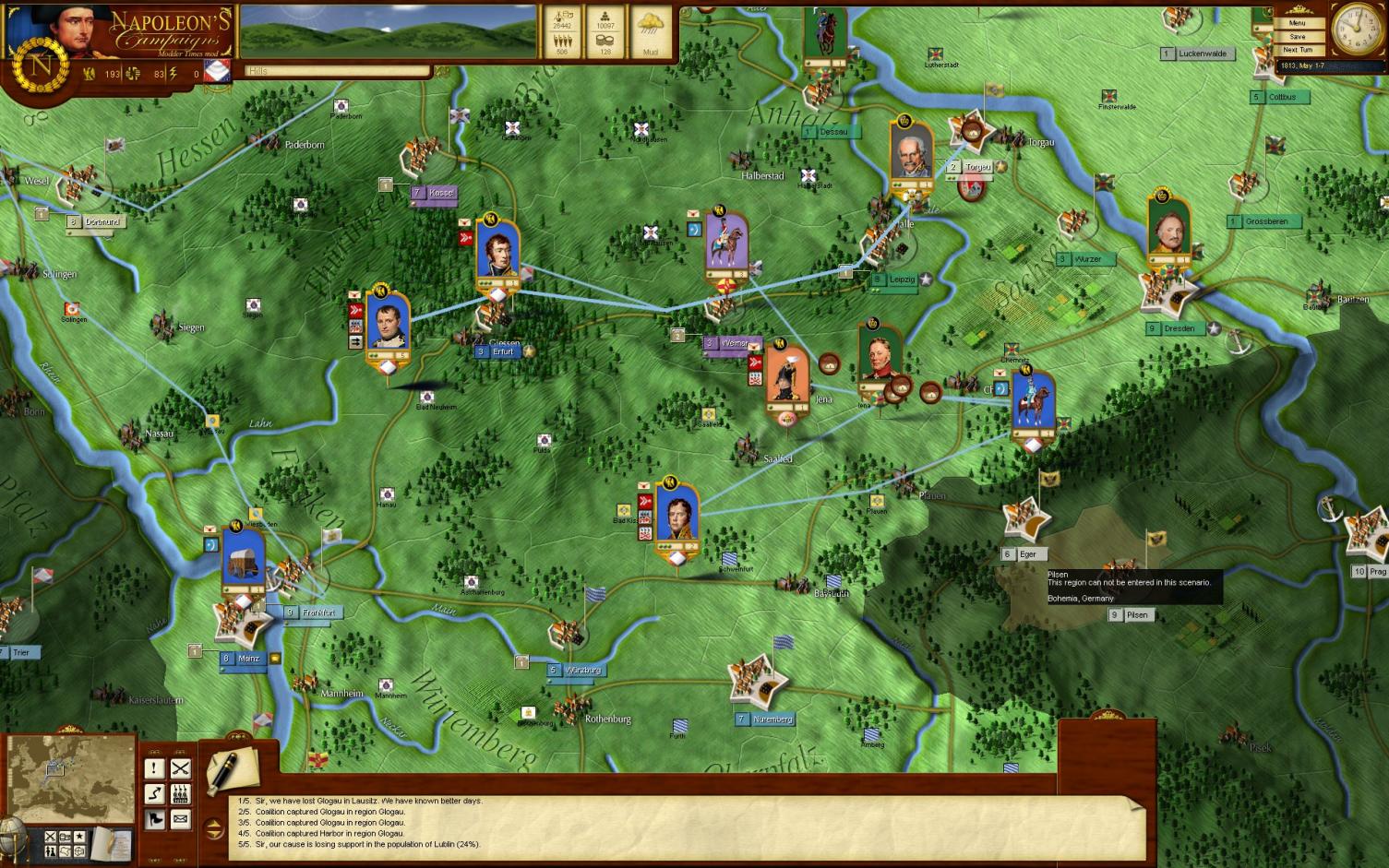 Esta victoria no ha evitado que los sajones rindan la importante plaza de Torgau! :confused: Como podeis ver ha sido ocupada por Blücher, que formaba la retaguardia de Kleist y Yorck. La división de caballería rusa de Duka se retira y ocupo otras provincias en Sajonia. Ney continua la marcha. Refuerzos en Erfurt, Eblé con pontoneros y otras unidades de la Guardia Imperial
