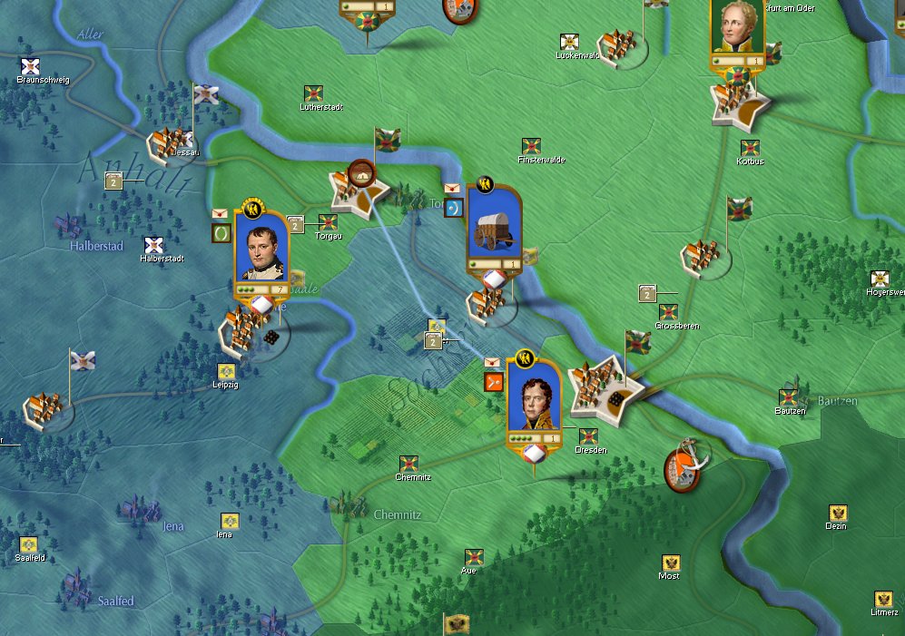 A su vez Napoleon debería tomar primero Torgau para avanzar hacia Dresde, comienzo con aislarlo, capturaré las ciudades adyacentes de Dessau y Wurzer para rodear completamente Torgau antes del asalto