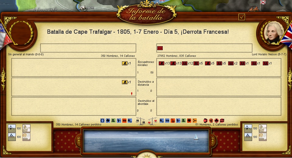 En cuanto a objetivos y estrategias, la intención es llegar primero con la flota reunida al Canal de la Mancha (a ser posible con el mínimo de bajas), y sólo entonces intentar el paso de la Grand Armée con la flotilla de invasión desde Boulogne. Esta será digamos la primera parte de la partida, donde la acción será eminentemente naval. El segundo objetivo, si consigo el primero, será conquistar con los cuerpos de ejército todas las regiones de las islas británicas que se puedan, intentado mantener a raya al mismo tiempo a la Royal Navy.