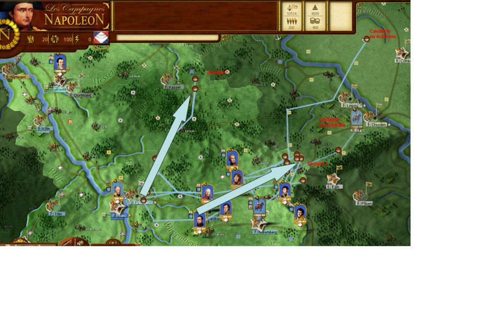 2/ création de 2 groupes distincts: le 1er groupe plus fort se dirigeant vers Dresde, le 2iéme dirigé par Napoléon composé evidemment de sa garde impériale, mais toutefois moins puissant, se dirigeant vers Breme.