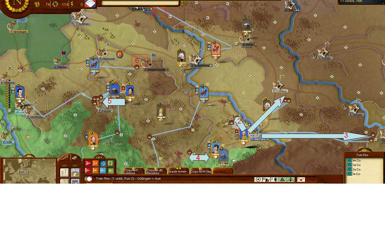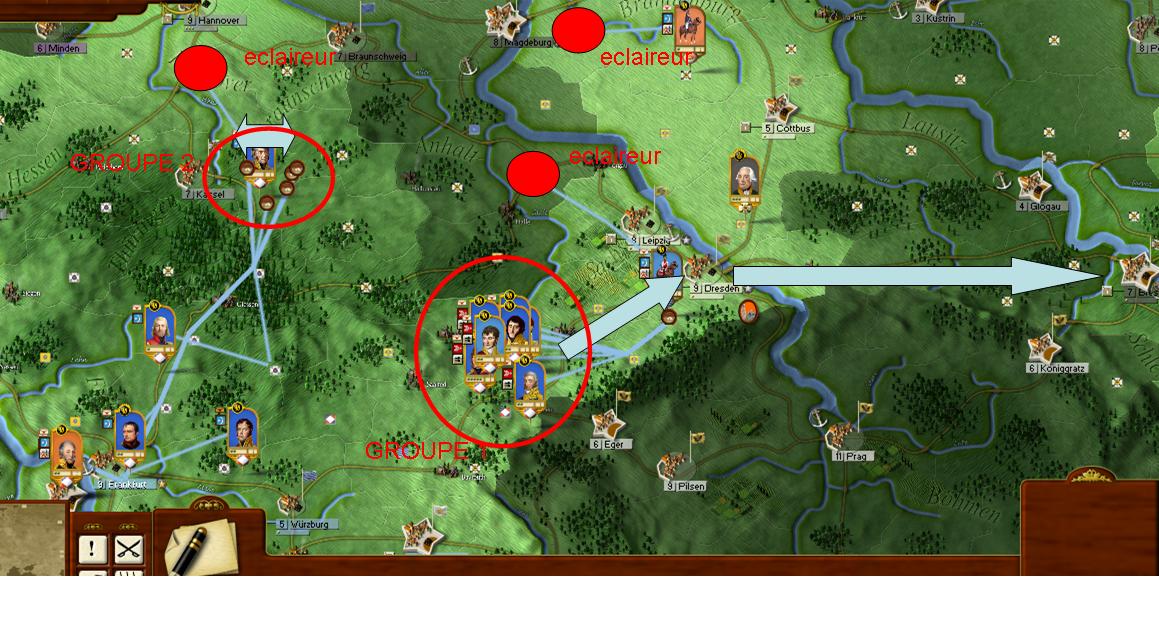 1/- battre le plus vite que possible l'armée de Pusse (<rité numérique): les meilleurs attaquants du groupe 1 cad Lannes, Davout et Augereau foncent sur l'armée de Prusse et assaut sur Cottbus (vivres ?!)