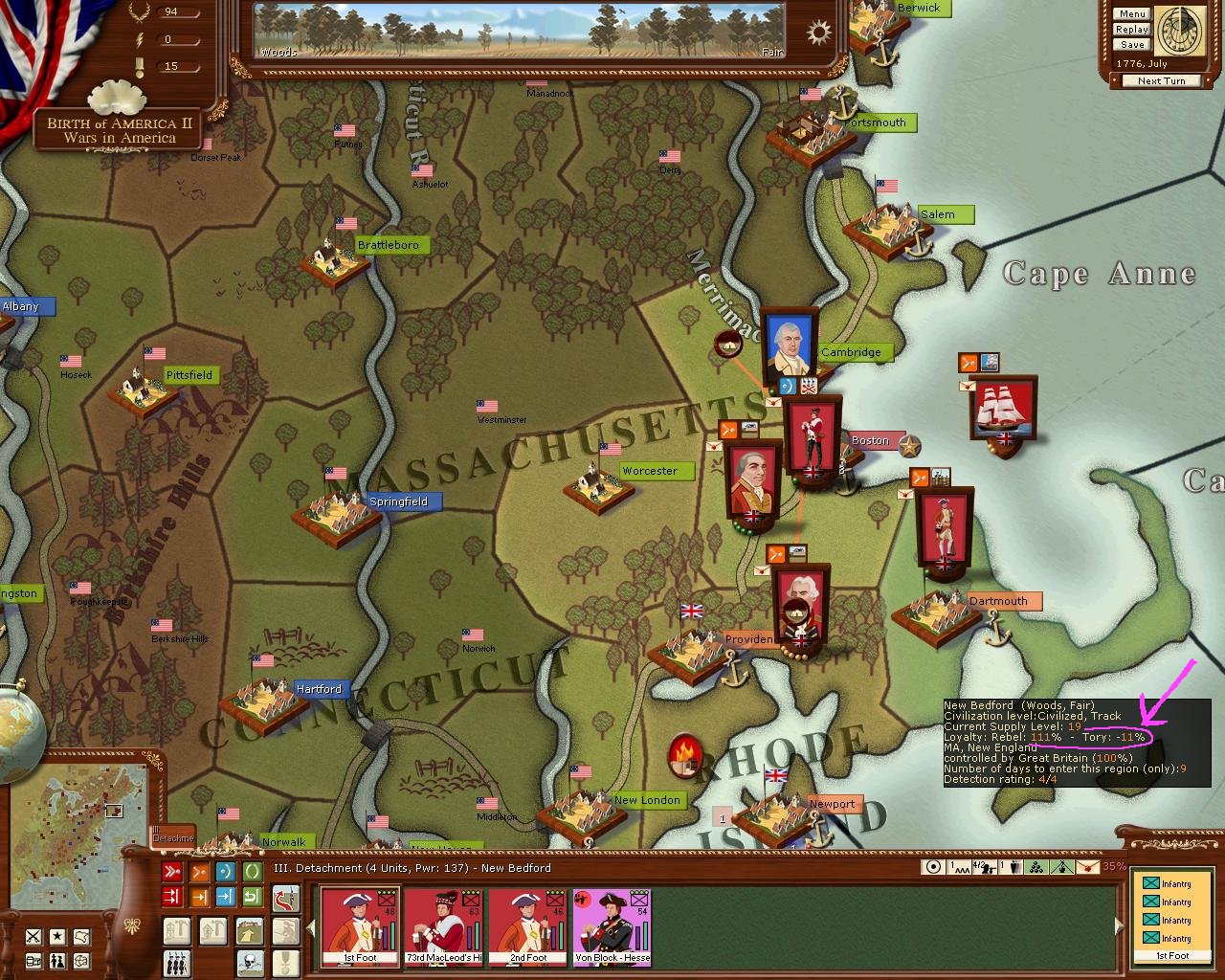 1., Before I activate the "Royal Pardon", I got 4-7% Tory royalty near Boston. But After Royal Pardon I got -8 (minus eight) and -11%... :( I guess, it's a bug.