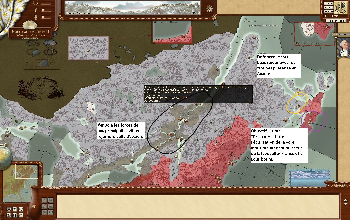 Avec l’aide de nos navires à proximité de l’Acadie et d’un village d’Indien j’ai pu regrouper 3 500 hommes principalement des régulier y compris une partie des forces assiégé qui on pu quitter le fort en évitant le combat puis recharger vers le fort Beauséjour et venir le reprendre tout cela avant les premières neiges du mois de novembre, les Anglais n’on cependant pas désiré de combat et on donc évité cette armée. Cependant, le moi d’après et cela malgré que les Indiens est pris leur quartier d’Hiver et que la neige soit tombée mon officier Charle Boishébert à jugé opportuns d’attaquer l’armée Britannique qui se situait au fort Lawrence, soit sur l’autre rive de l’Acadie, le résultat fut cette belle victoire :