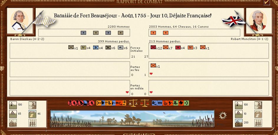 Fort de ses deux victoires nos avons acquis lors de ses combats des pièces de mortier, de l’artillerie et un chariot de ravitaillement qui nous à permis de venir faire le siège au fort Cumberland et de l’anéantir suite à sa prise. Suite à ses deux belles victoires, je me dois de préciser que j'ai promut au rang de maréchal le Chevalier Rigaud.