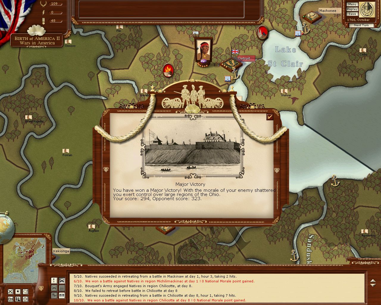 September/October '66. Browning is able to keep Custaloga’s Indians from retaking the settlement at Michilimackinac.