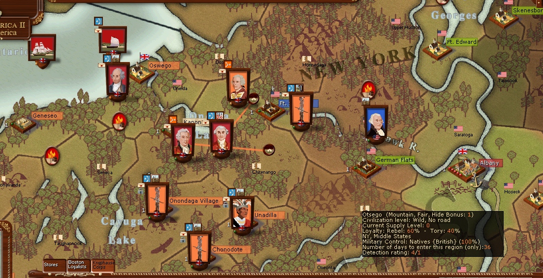 I spend 20 EPs on releasing an Indian warband.Washington is still at Albany with an ominous looking army how im going to defeat him now im not sure maybe i need to go on the defensive for a while.