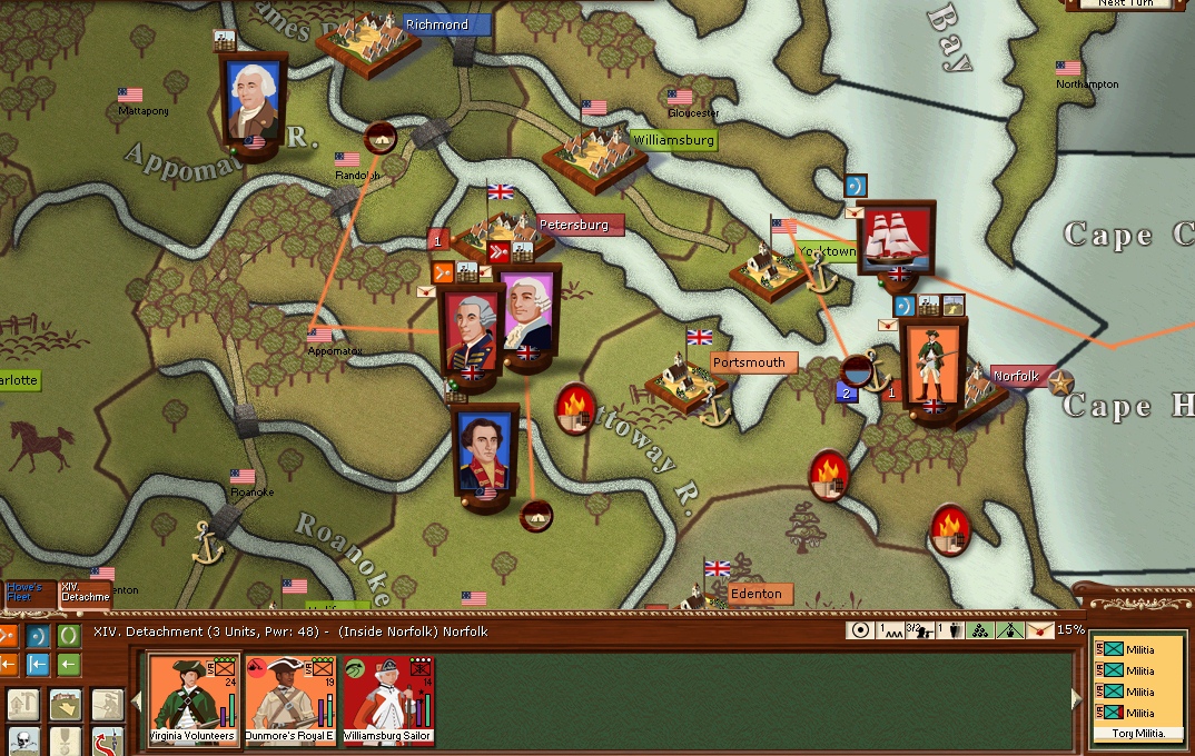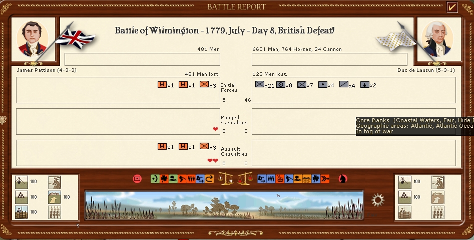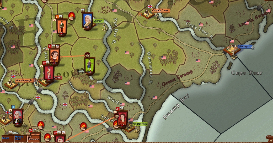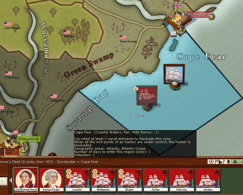 Admiral Howe sails from Charleston to engage a French invasion fleet at cape fear,Unfortunatly for me the French disembark there army before my fleet arrives and attacks Wilmington destroying the garrison and capturing the town.