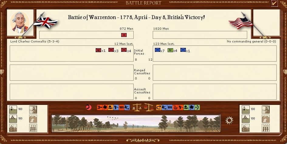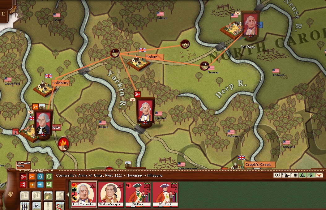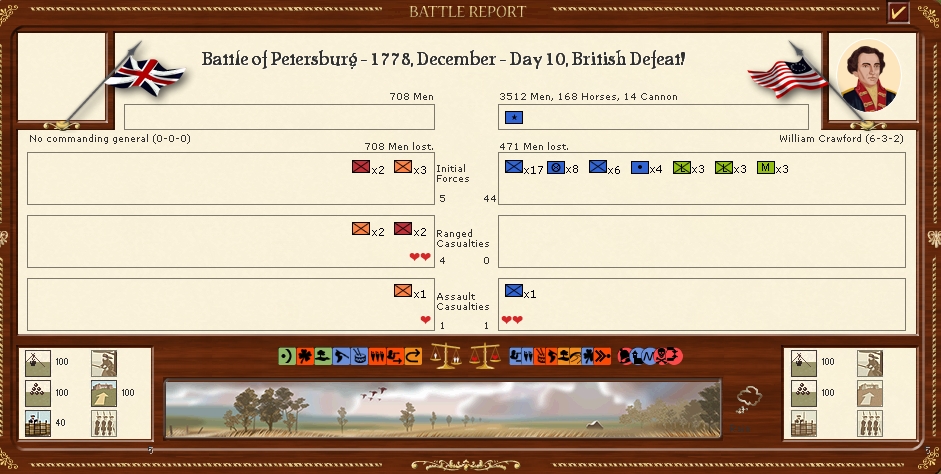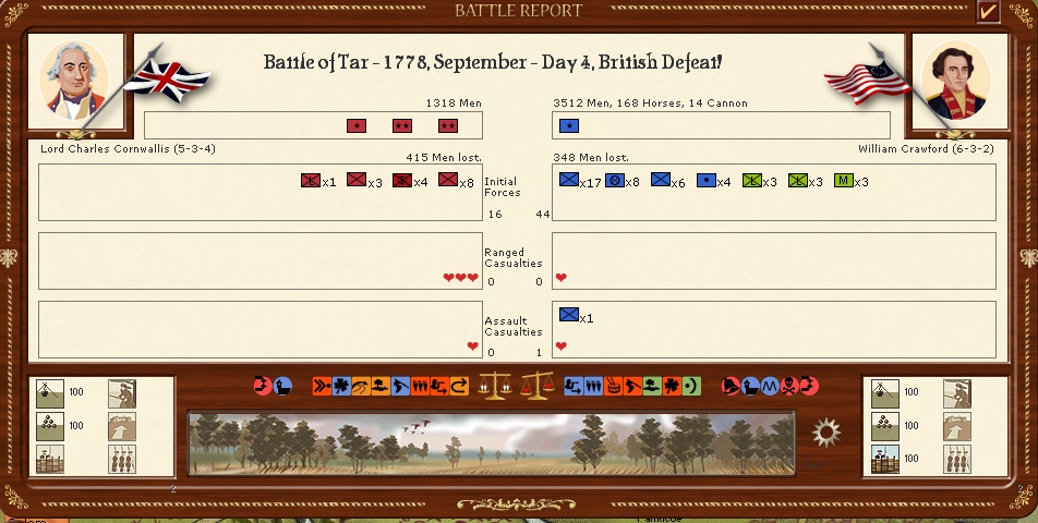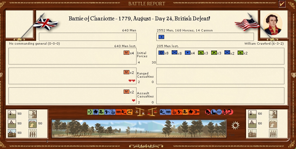 Tarleton has clashed with William Crawfords army near charlotte and comes off worst,However Crawford disapears into the wilderness.