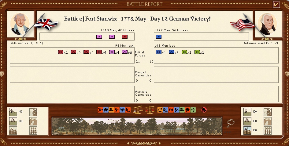 Prescotts brigade has marched to attack Ft Stanwix but is repulsed,He will now await the arrival of the German Rall's brigade and attack next turn.