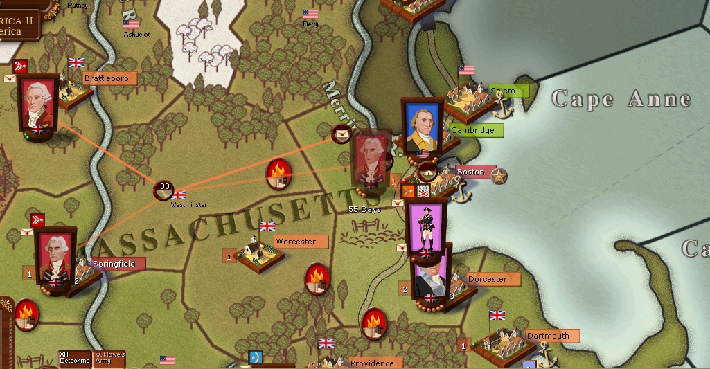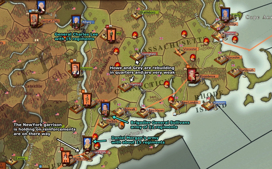 The armies in New England are resting for the moment in the hope that i can resume operations soon however a lot of the battalions are well below strengh.