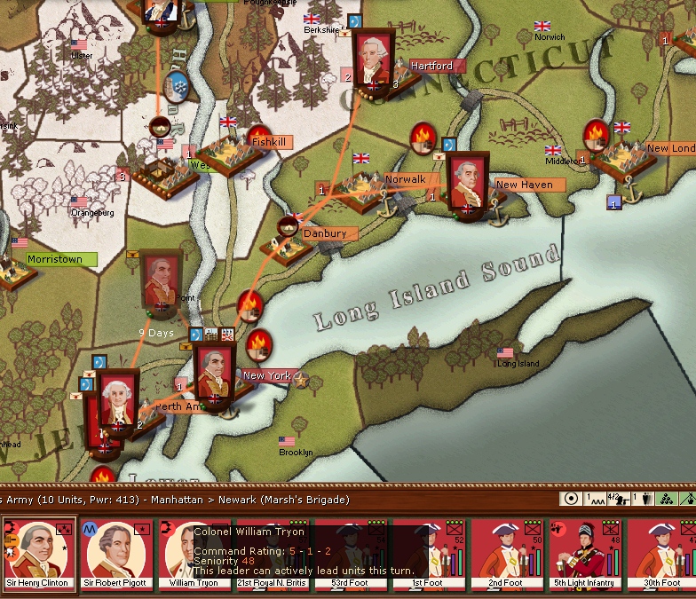 The bad weather is starting to turn to spring now so campaining will begin next turn,General Washington and Greene are spotted in Durham and Derry and will be brought to battle in the comming monthes.