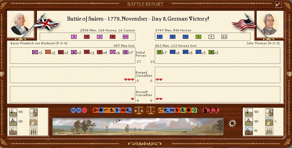 In New England Leslies corps of 6 battalions and Von Riedesels corps of 9 battalions move to engage the American Thomas's army in westminster who is attacked twice.