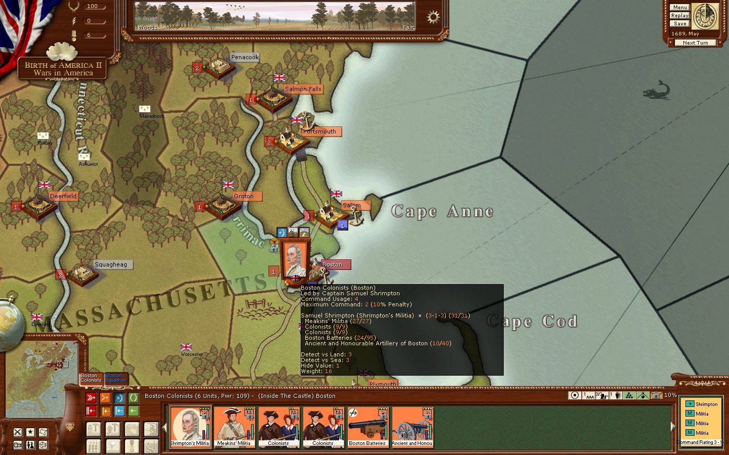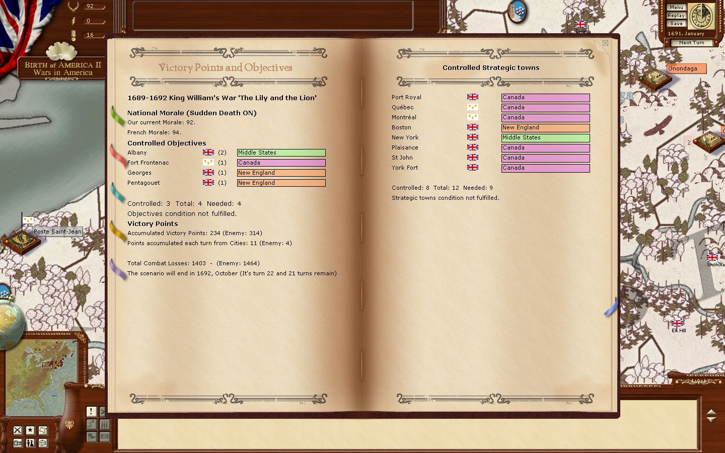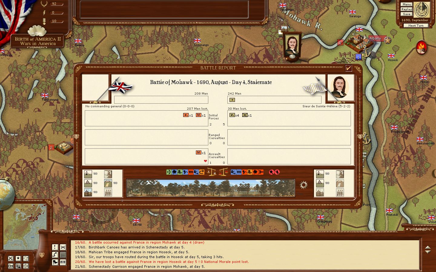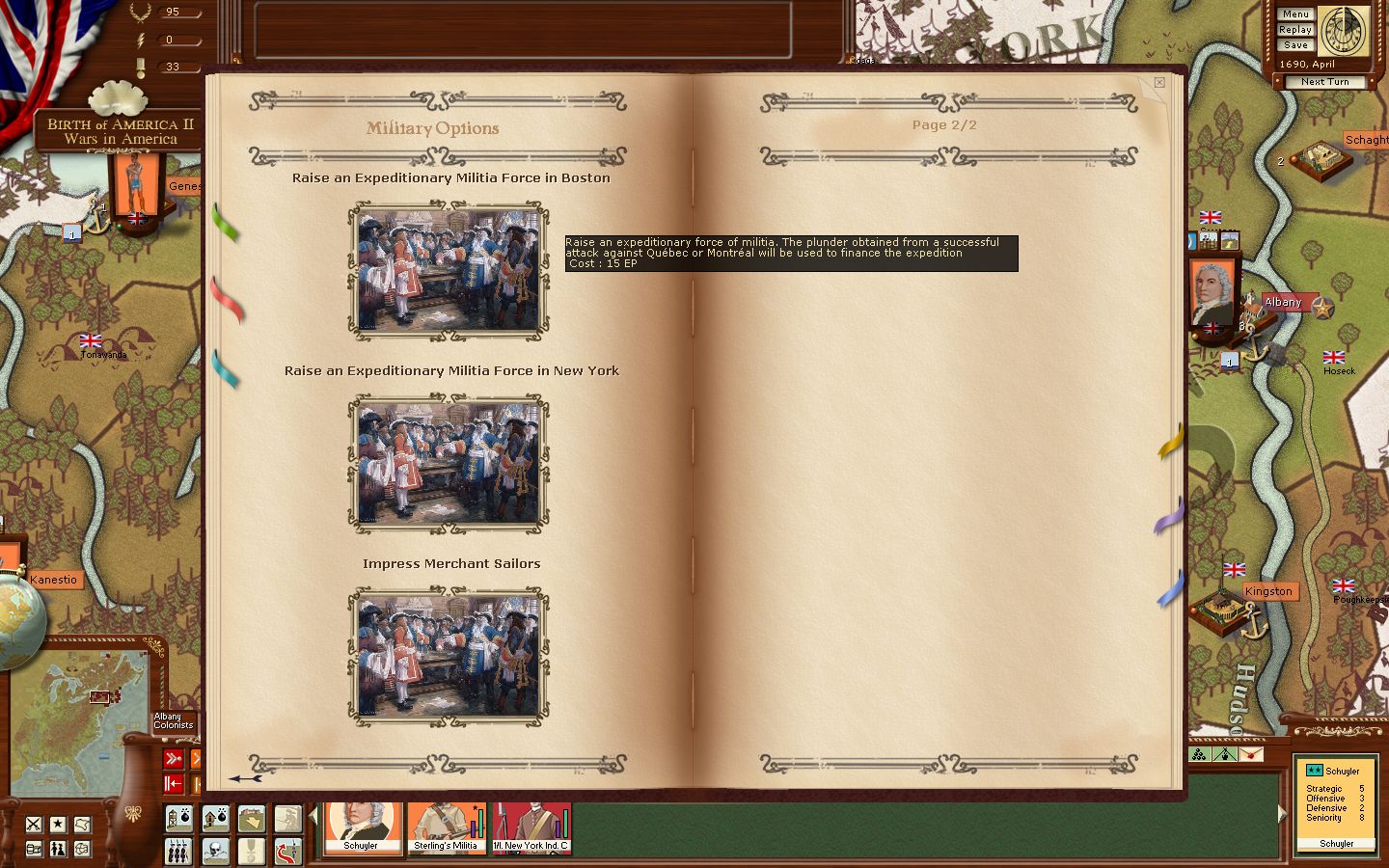 If the option is chosen by both sides each side will get a high chance of ahistorical options being made available to them (but they won't know if this is the case until the options appear). In reality both sides could have fielded stronger armies. Phips proposed another attack against Québec after his abortive 1690 attempt while the French had ideas for an attack against the eastern seaboard. If both sides have chosen to allow hypothetical events it may be that only one side will be given the opportunity. They may also lose the chance depending on game situation. The options will have a cost in both EP and VP so they will not be easy options and are designed to give players a different experience rather than an easier one. Of course being options - the player may choose not to take them when offered. If this option is chosen and is triggered the scenario will end a year later in 1693.