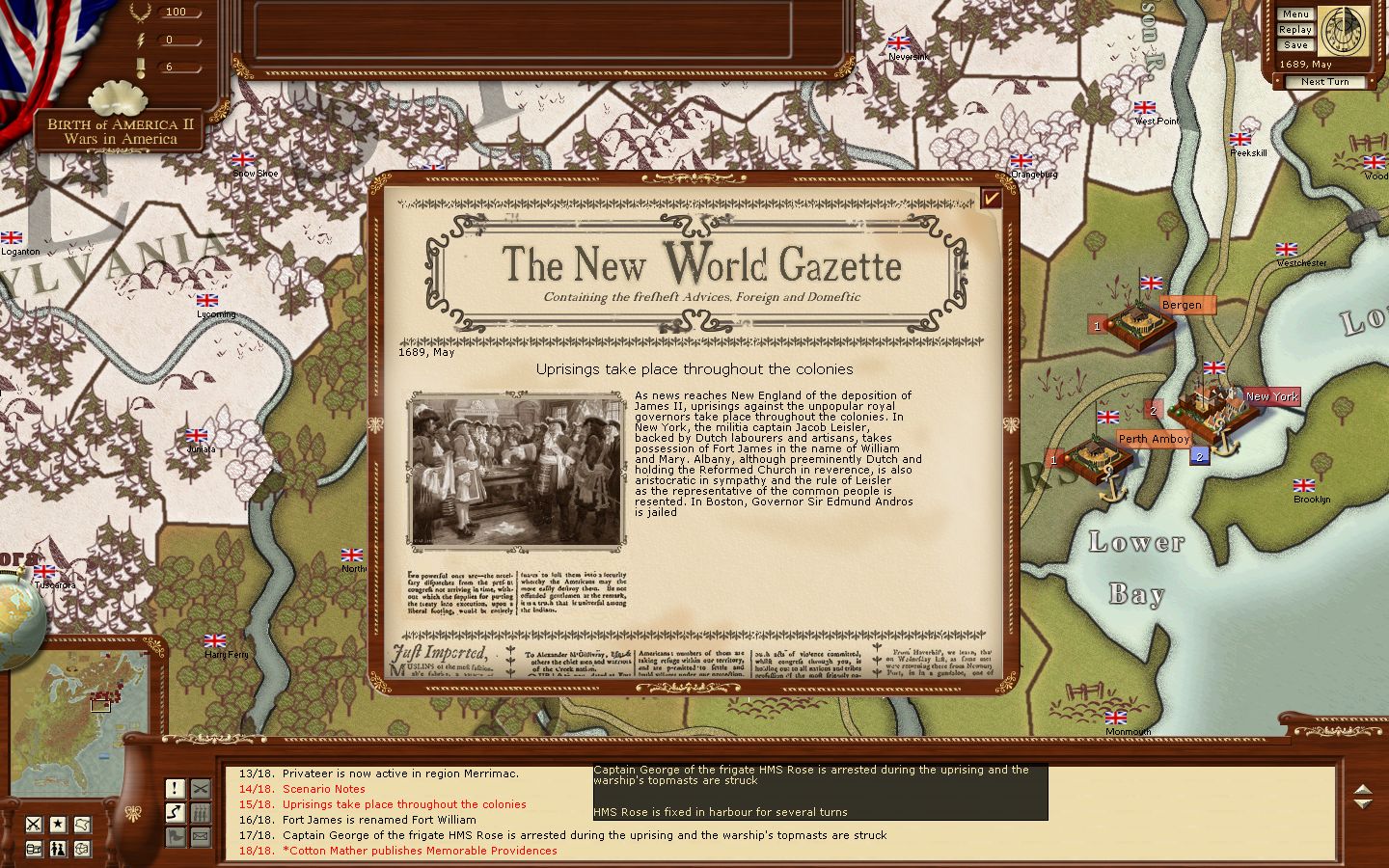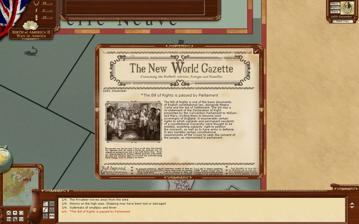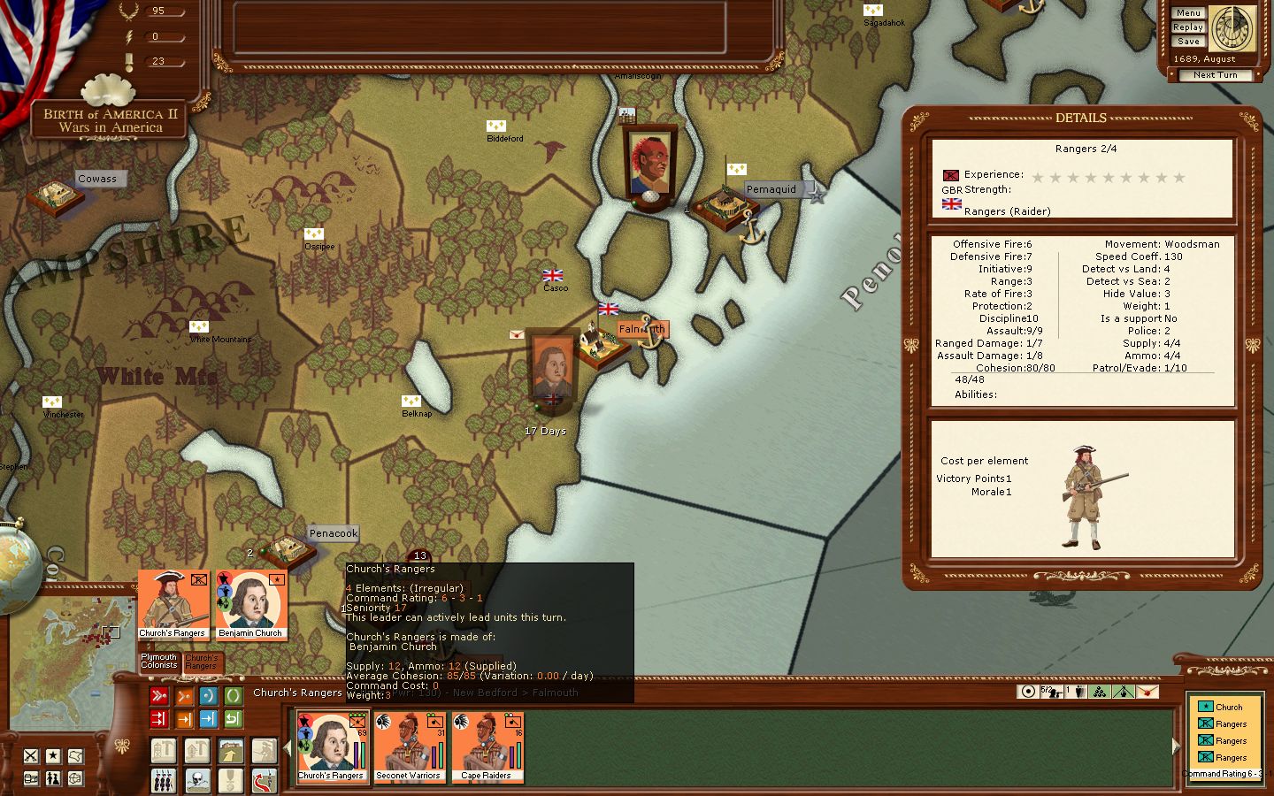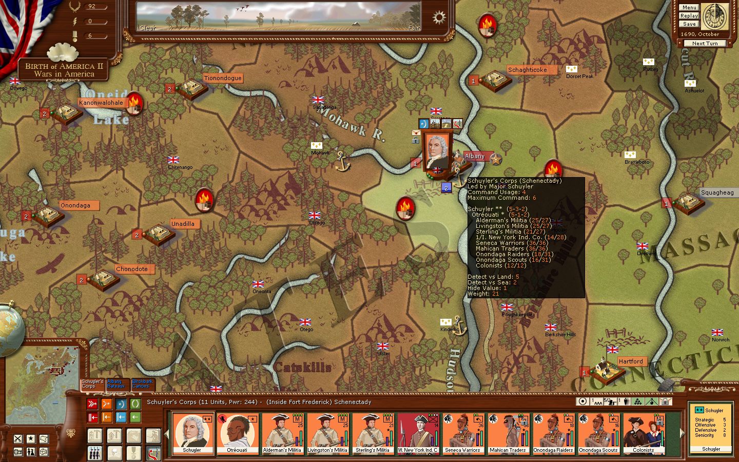 If the option is chosen by both sides each side will get a high chance of ahistorical options being made available to them (but they won't know if this is the case until the options appear). In reality both sides could have fielded stronger armies. Phips proposed another attack against Québec after his abortive 1690 attempt while the French had ideas for an attack against the eastern seaboard. If both sides have chosen to allow hypothetical events it may be that only one side will be given the opportunity. They may also lose the chance depending on game situation. The options will have a cost in both EP and VP so they will not be easy options and are designed to give players a different experience rather than an easier one. Of course being options - the player may choose not to take them when offered. If this option is chosen and is triggered the scenario will end a year later in 1693.