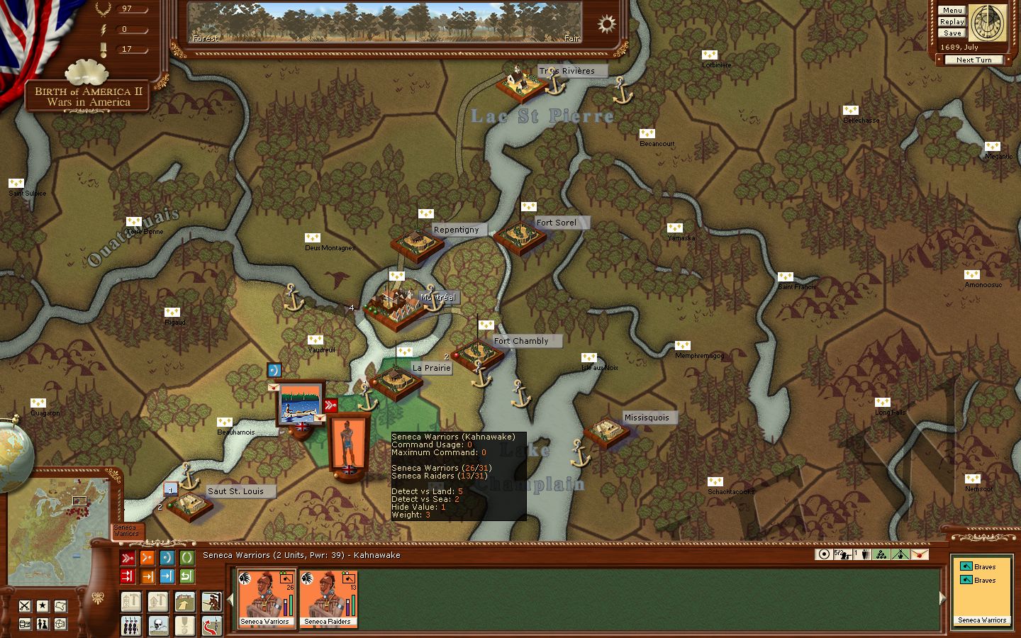 The King William’s War scenario offers the player many military and diplomatic options. As with the Pontiac scenario, but unlike other WiA scenarios, once offered, these options may not remain available to the player due to a change of circumstance; lack of region control, time of year or game situation.