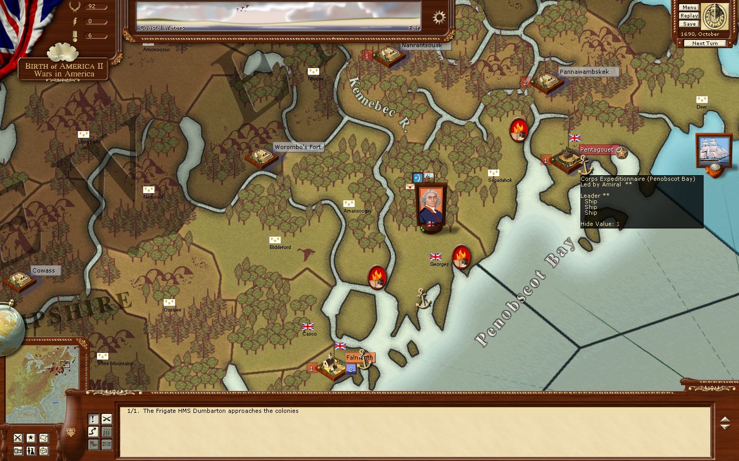 To the east Pentagouet surrenders to Wally's troops but his overconfidence left the recently re-captured Pemaquid lightly defended.