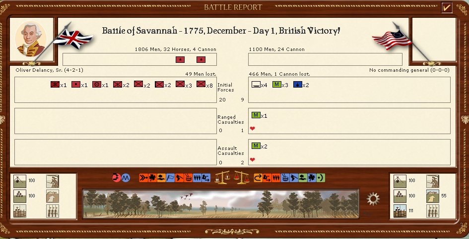 General Delancy leads British forces successfully into Savannah GA, then leads them through Georgia to secure the contested region around Augusta. Meanwhile, NC Tories raid rebel territory and secure the key positions of Charlotte and Wilmington. Admiral Howe also gets a bit of fortune, and sinks a rebel militia attempting to escape by Bayeaux off the coast of Wilmington. All in all, the Deep South actions have started well, and with the arrival of Cornwallis' army promised in a few months, we should be in good shape to secure GA, SC, and NC in 1776.