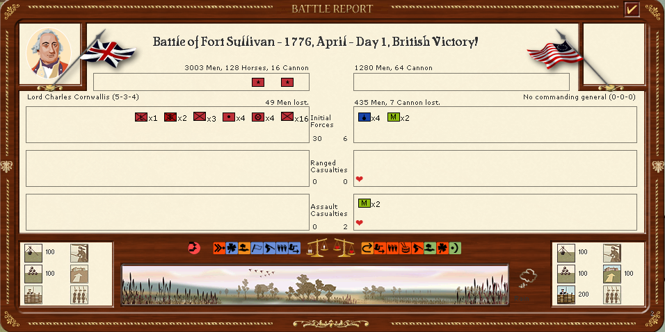 3) So, I think the scenario would be better balanced if the initial Boston fleets for the British either didn't show up until August or September 1775, or were fixed until this time. Howe's reinforcement army could be active, therefore leading to a historical Bunker Hill battle, or it could threaten more of Massachusetts if the patriots pull forces back from the siege, but it wouldn't be able to threaten the very exposed coastline anywhere at whim. And attempting a naval landing in fall/winter is a far riskier proposition for the British if they had to wait, particularly to September to do so (not to mention the patriots would have some reinforcements). This one change, IMO, would make the scenario largely balanced.