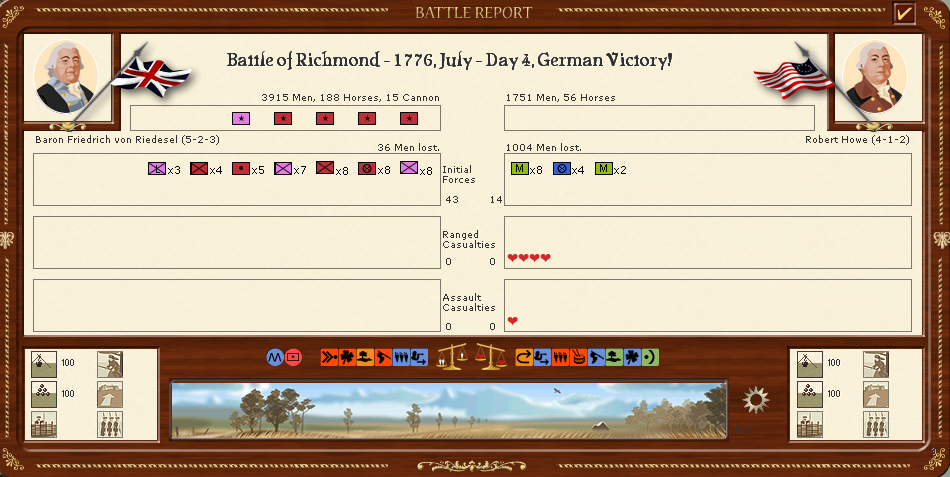 Anyway, it's a very interesting scenario, much like a boxing match of wearing your opponent out. I do think it's slightly broken in British favor, but this would be easily addressed by item #2. With that one small change, I think it'd be a very historical and tit-for-tat campaign.