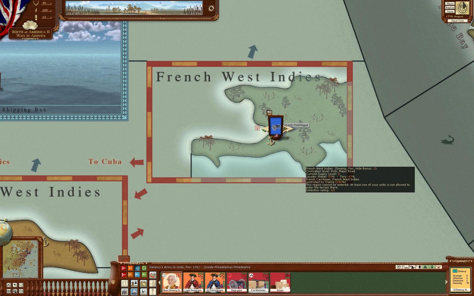 An US artillery unit in French West Indies. It seems that the unit was automatically deployed there upon the purchase, but the French are not yet in war and the unit is kinda trapped there.