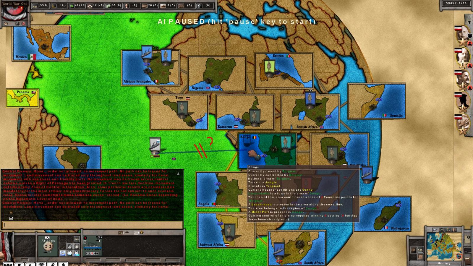 - I want to move my Karslruhe LC squadron with a "raid" mission against the town of Kongo (or Nigeria, or Afrique Française). This is not allowed (second pic) Why ?