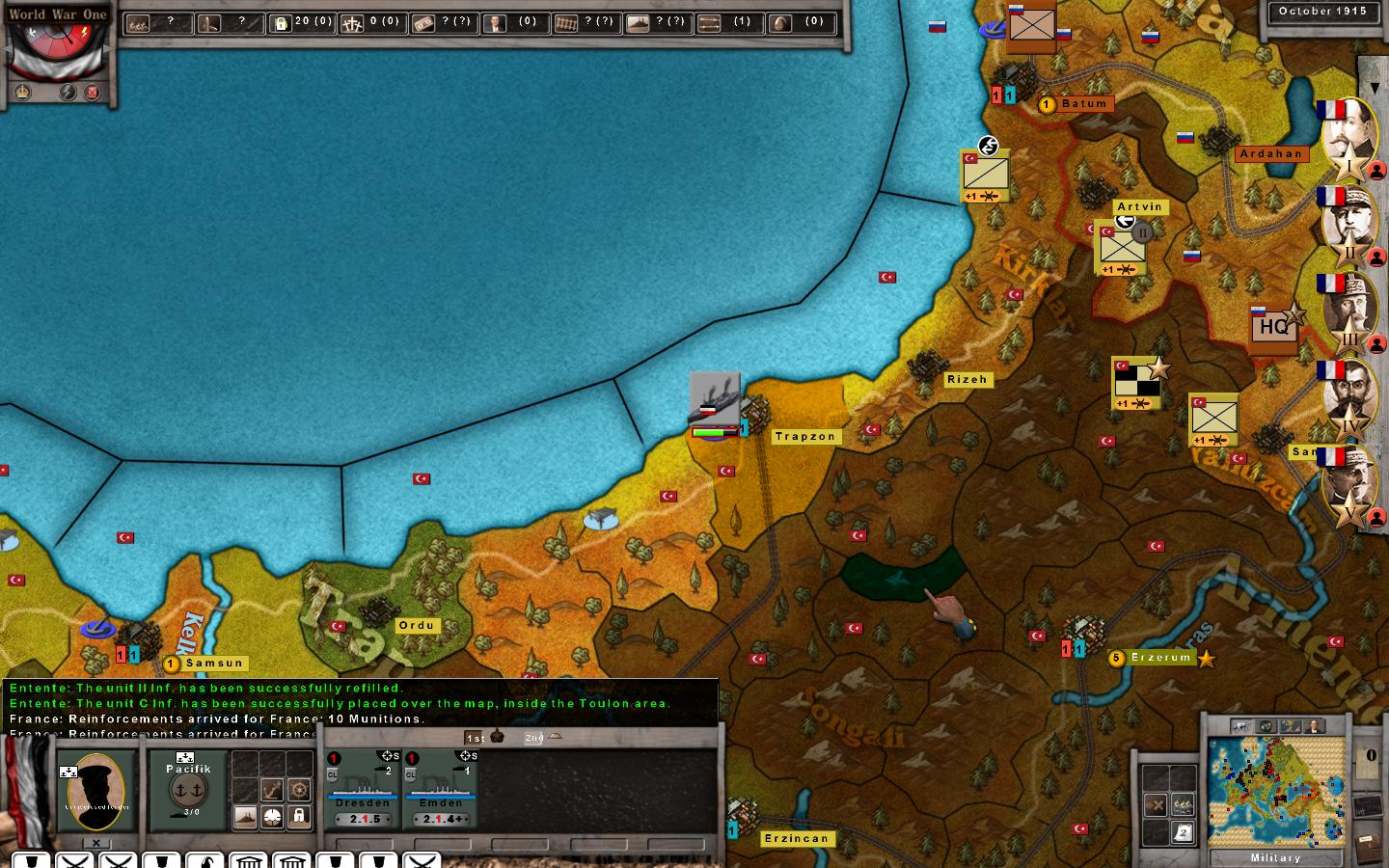 September 1915, Japanese forces finally take the German port of Tsing Tao where the survivors of the East Asia Squadron took refuge. In the October turn they magically appeared in the Turkish Black Sea port of Trebezon.
