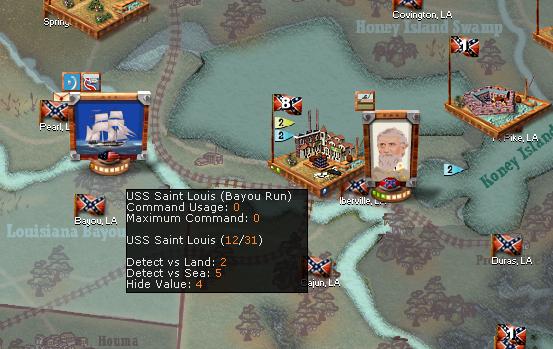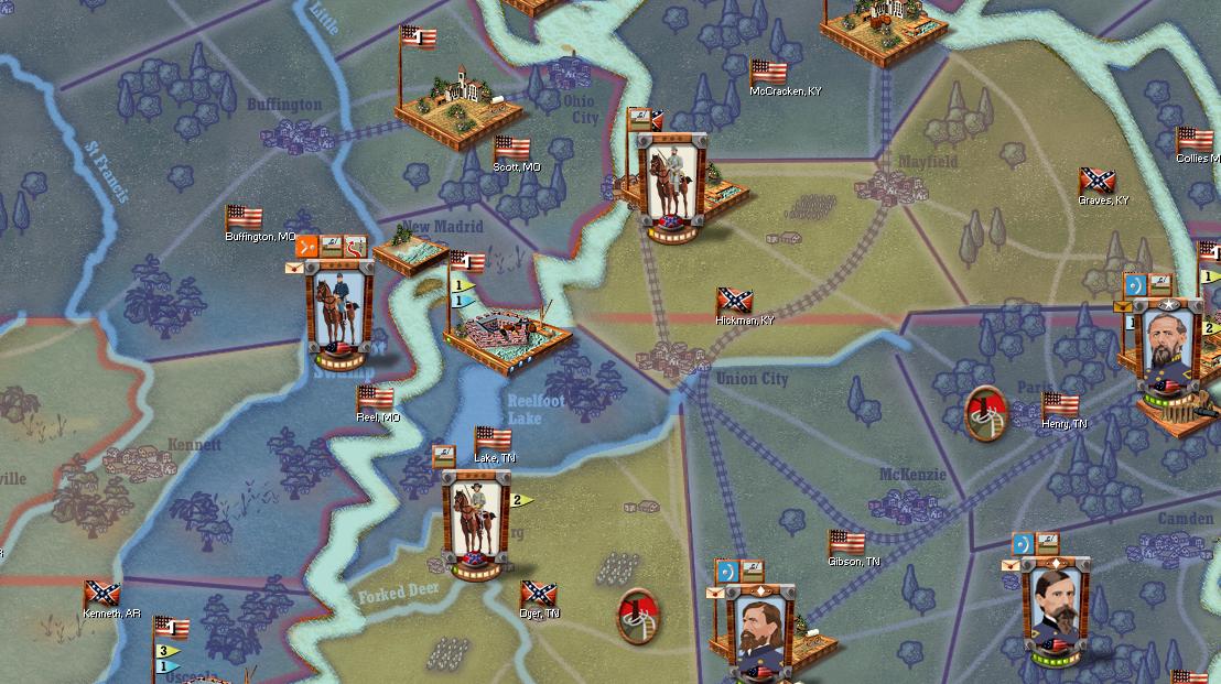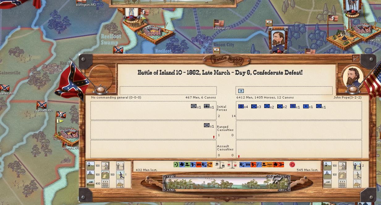 It is late March. Winter's grasp on the Mississippi seems to be waning, and the Union river fleet has sprung into action. Admirals Andrew Foote and David Porter arrive at Island No. 10 with eight gunboats and four iron clads. Island 10's 500-man garrison defends valiantly,m but with 13-1 odds and a relentless pounding from the river guns, they are liquidated.