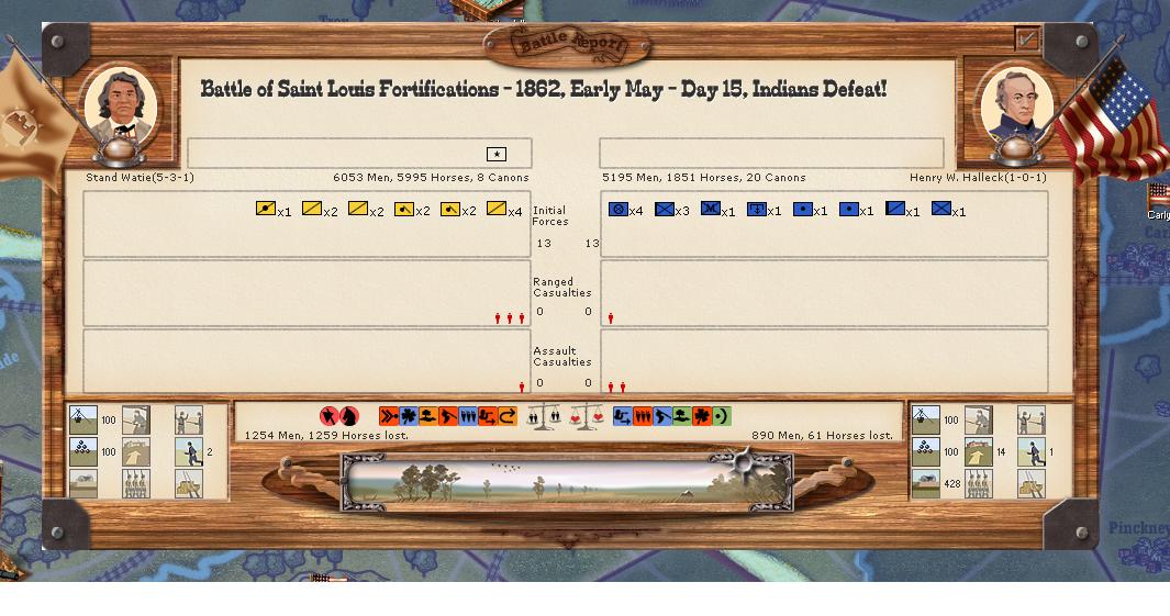 Action in the Trans Miss: Stand Watie launches a surprise attack on St Louis. Six thousand warriors and CSA cav assault the garrison of 5,500 led by Halleck. Union artillery proves decisive. The Indians thinking it to be thunder made by angry Gods scramble back into the steppe.