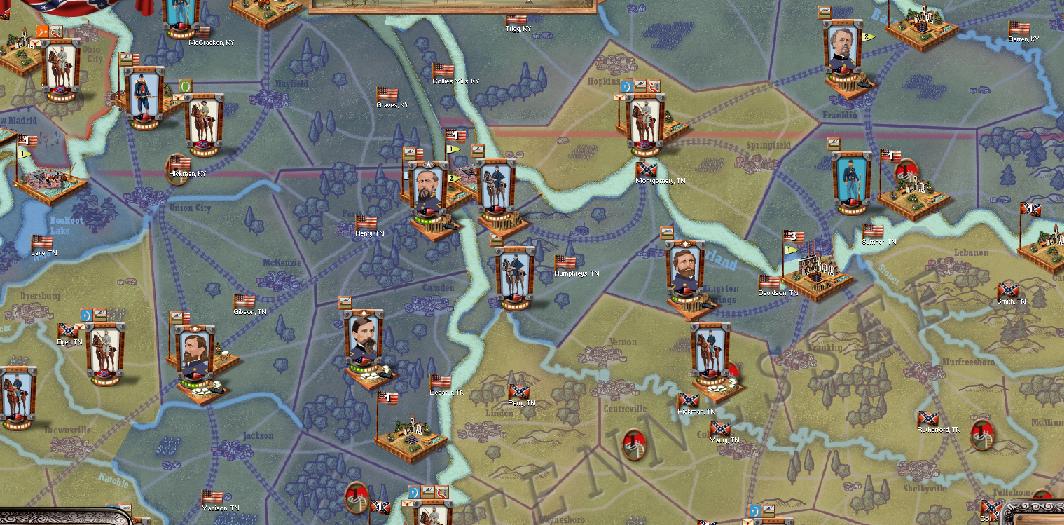 TN:Cav elements from both sides disperse, no engagements. Several rails in CSA territory have been destroyed, however. 3rd Kentucky US Cav continues its pacification programme, subduing Jackson. CSA elements move to the front lines as well, Livingstone falls.