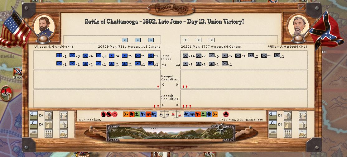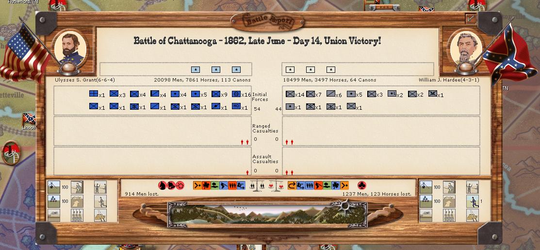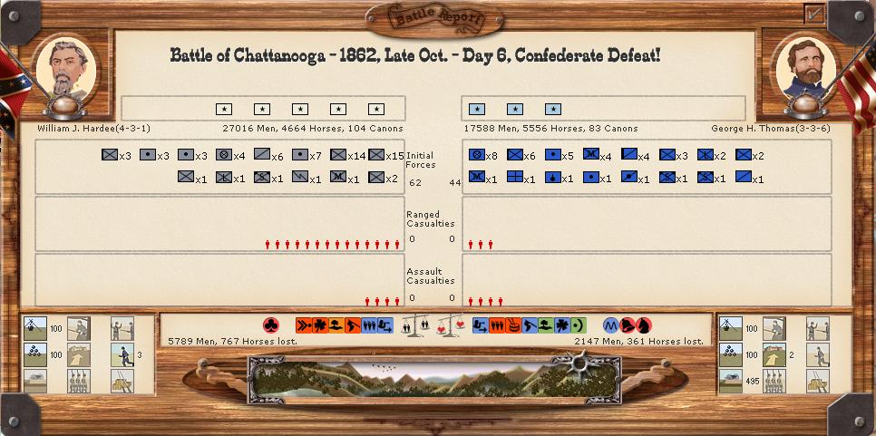 Initially CSA cav elements isolate L. Rousseau's Corps in Knoxville by capturing Decatur. Thomas' folrces are dug in like an Alabama tick in mountainous territory, however. When the results come in it's somewhat of a foregone conclusion. CSA forces attack for two days and 10,000 casualties later give up the fight. Perhaps faulty intelligence or desperation led to the attack, or perhaps boredom on a quiet front.